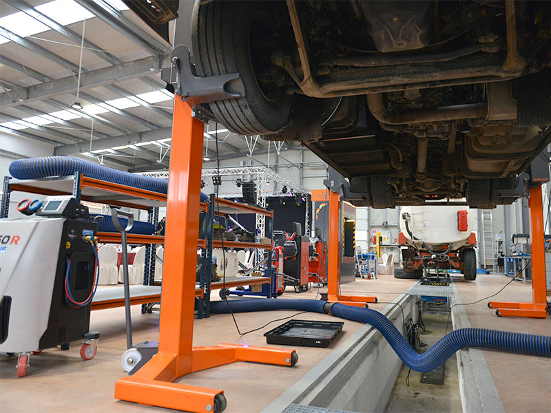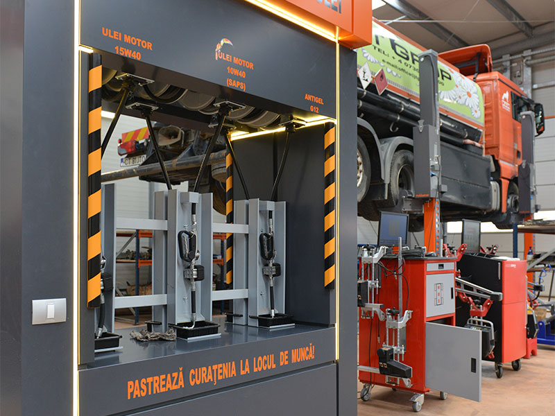 Lucrarile de mentenanta si reviziile periodice pot fi executate pe 4 posturi de lucru gratie unui sistem centralizat de distributie a uleiului, iar pozitionarea uleiurilor de transmisie in canal impreuna cu tavile mobile de colectare a uleiului uzat, conduc la un serviciu operativ si mai curat.